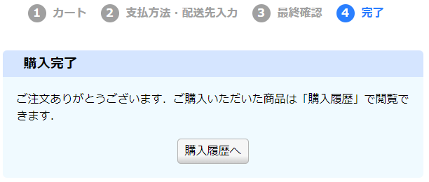 問題なく決済処理が完了すると,「購入完了」の画面が表示されます.何らかの問題が生じた場合はエラー・メッセージが表示されますので,適宜指示にしたがって対応してください.クレジットカード自体の問題は,当方では対応できかねますのでご了承ください.
