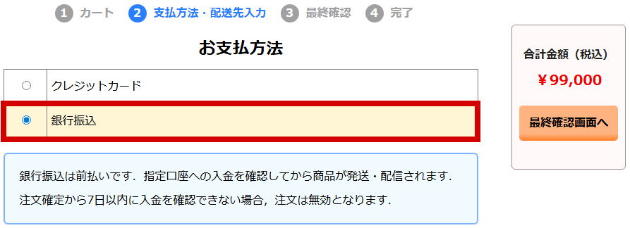 最終確認画面(銀行振込を選択した場合)