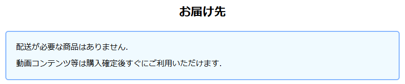 配送が必要な商品がある場合,配送先の入力欄が表示されます.「登録済みの住所へ送る」を選択すると,会員情報として登録されている住所へ配送されます.