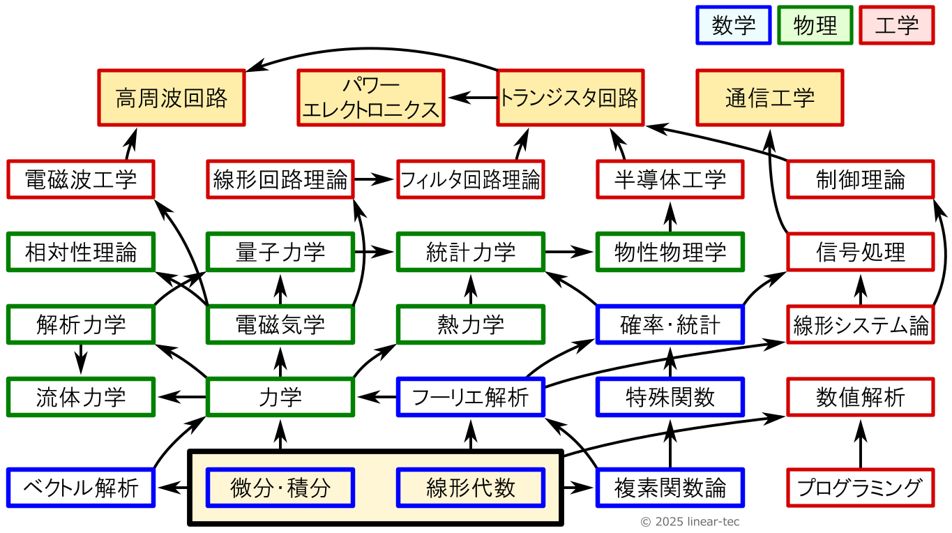 上の図は数学,物理,そして電気・電子工学の各分野を体系的にまとめたものです.図中の矢印は,おすすめの学習順序(あるいは理論の依存関係)を示しています.電気・電子工学は広大な分野であり,1つの図で表現するのは困難です.ここに示した内容はあくまで参考程度にとらえてください.