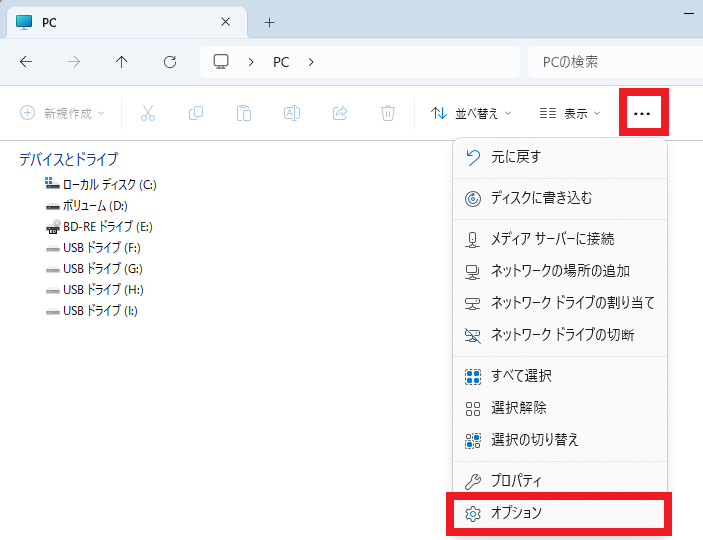 エクスプローラの上部メニューの中から [...] ボタンをクリックします.プルダウン・メニューが展開されるので,一番下の [オプション] をクリックします.