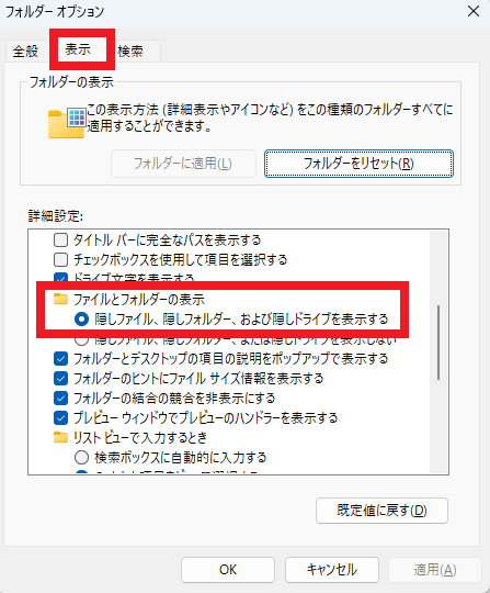 「詳細設定」のリストの中から「ファイルとフォルダーの表示」という項目を探します.ここで「隠しファイル,隠しフォルダー,および隠しドライブを表示する」が選択されていることを確認します.もし選択されていない場合は,これを選択します.