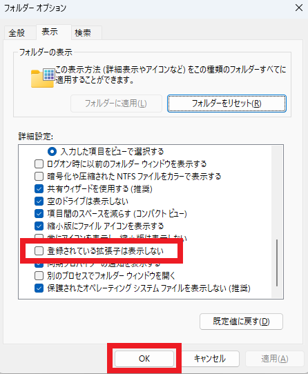 続いて,同じリストの中から「登録されている拡張子は表示しない」という項目を探します.このチェックが外れていることを確認します.もしチェックが付いている場合は,チェックを外してください.