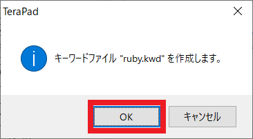 「キーワードファイル "ruby.kwd" を作成します。」というメッセージが表示されるので,[OK] をクリックします.