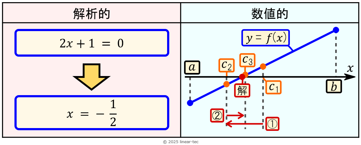このように,式変形だけで方程式の解を得る操作を「解析的」な解き方といいます.なお,式を変形する手順は他にも考えられます.たとえば最初に「両辺を $2$ で割る」など,いくらでも自由度があります.それでも,最終的な結果は “$x=-1/2$” という値に一意に定まります.当然だと思われるかもしれませんが,これは解析的な計算の重要な性質です.また,この “$-1/2$” という値には一切の誤差が含まれません.あくまでも純粋な “$-1/2$” です(たとえば “$-0.5000001$” などにはならない).