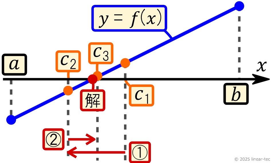 [手順4] こうして得られた新しい “$a$” と “$b$” に対して,再び [手順2] の式で中点 “$c$” を計算し,[手順3] にしたがって “$a$” と “$b$” を更新します.これを繰り返せば,中点 “$c$” の値が真の解 “$x$” に限りなく近づいていきます.実際に上図で各ステップにおける中点の動きを追うと,“$c_1 \to c_2 \to c_3$” と移動するにつれて「解」に近づいていることがわかります.