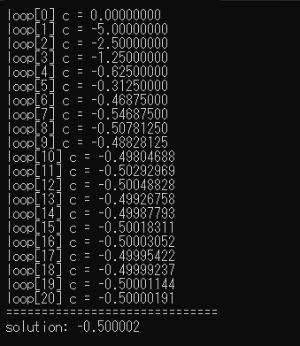 今回の計算結果の $-0.500002$ は,同じ方程式を「解析的」に解いた結果である $-1/2$ と整合します.今回は許容誤差 “epsilon” の値を $1\times 10^{-5}$ に設定したので,小数第5位までの $-0.50000$ は真の解 $-1/2$ と一致します.しかし,小数第6位は $2$ であり誤差が生じていることがわかります.変数 “epsilon” の値によって誤差の大きさは変わりますが,本質的に何らかの誤差が生じることは変わりません.そういった意味で,コンピュータによる数値計算の結果はあくまで「近似解」だと見なすべきです.