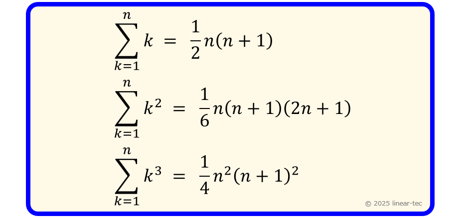 ここまでの例からわかるとおり,一般に “$\Sigma k^m$” の公式を作りたい時は「“$(k+1)^{m+1}$” と “$k^{m+1}$” の差」から話を始めるとうまくいきます.
