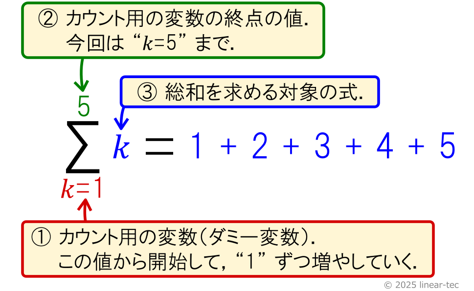 ③ “$\Sigma$” の後に,総和を求める対象の式を記述します.今回は単に “$k$” と書いてあるので,カウント用の変数 “$k$” の値そのものを順番に加算します.初期値の “$k=1$” から始めて,終了値の “$k=5$” になるまで “$k$” の値を $1$ ずつ増やしていきます.