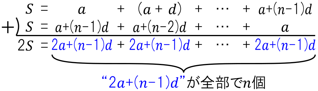 上式の両辺を $2$ で割れば,「初項“ $a$”,公差 “$d$” の等差数列の第$n$項までの総和を求める公式」が得られます.