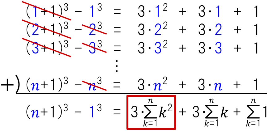 上式の総和を求める準備として,「“$(k+1)^3$” と “$k^3$” の差」を考えます.