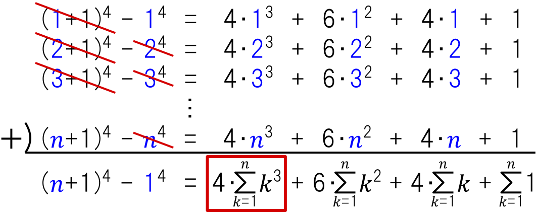 上式の総和を求める準備として,「“$(k+1)^4$” と “$k^4$” の差」を考えます.