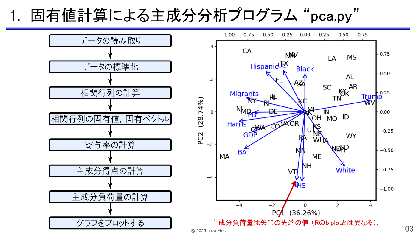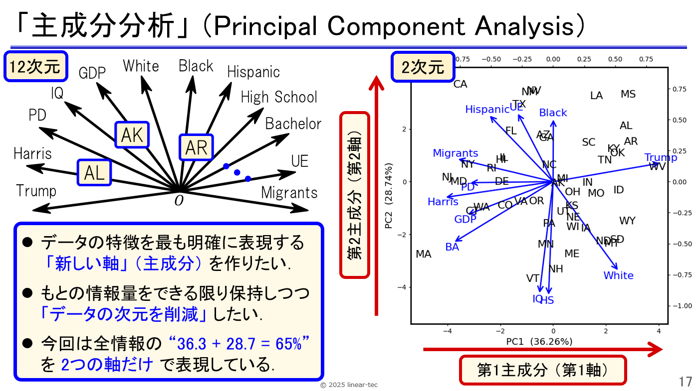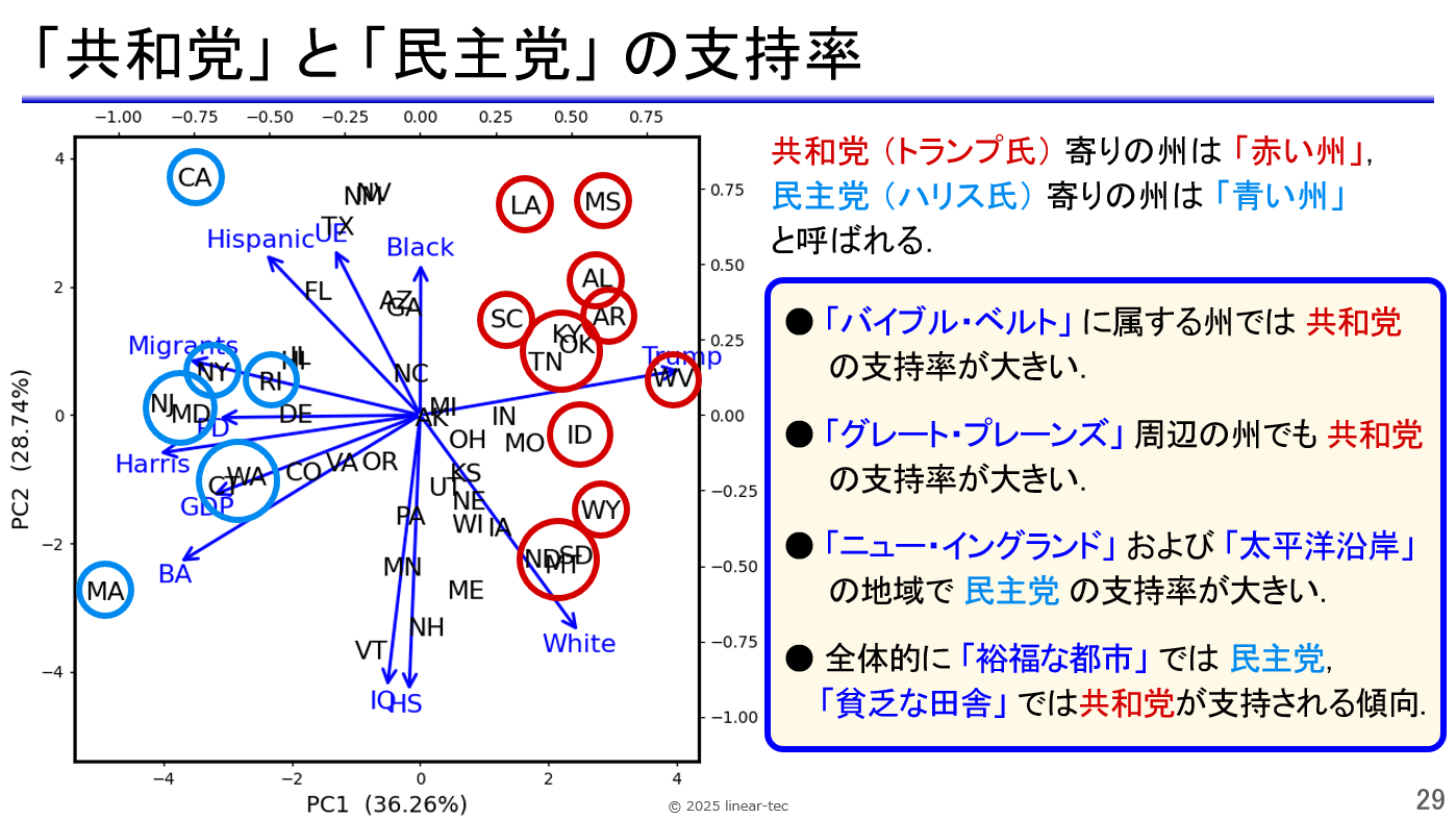 本セミナでは,2024年末に行われたアメリカ大統領選挙およびアメリカ国勢調査のデータを題材として「いまアメリカで何が起きているのか」をデータ分析によって解き明かします.主成分分析の結果には,アメリカ全50州の特徴が明確に反映されています.統計解析の技術を習得した上で,さらにアメリカという国に対する解像度を上げることができるため,数学的な話と社会的な話の2つを同時に楽しむことができます.