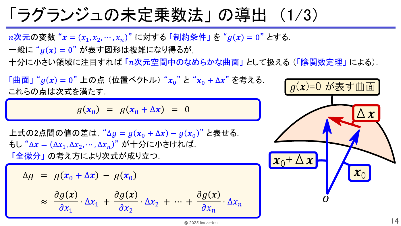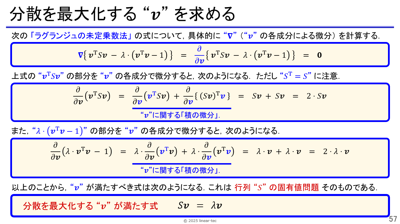 データ分析の分野では「最も効率の良い計算方法」や「最も多くの情報量を引き出すための処理」といったものを探すことがよくあります.こうした時に使われるのが「微分」のテクニックであり,特に「ラグランジュの未定乗数法」は制約条件のもとで最適化を行うための強力な技法です.主成分分析でも,ラグランジュの未定乗数法が重要な役割を果たします.