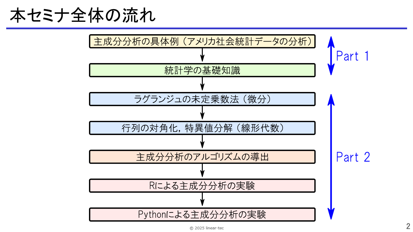 主成分分析のアルゴリズムには 微分,線形代数,確率,統計 といった一般的なデータ分析で必要となる要素技術がすべて含まれています.本セミナでは,数学の基礎から主成分分析のアルゴリズムの導出まで一気通貫で解説します.
