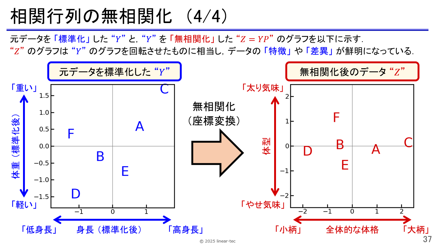 一般的なデータの変換や加工といった処理は,「ベクトルに対する線形写像」だと見なすことができます.そして,この線形写像に関するノウハウをまとめた体系が「線形代数」です.特に,主成分分析は線形代数における「固有値問題」と深い関係があります.固有値問題の帰結として得られる「データの無相関化」も含めて,主成分分析で行う処理の本質的な意味を解説します.